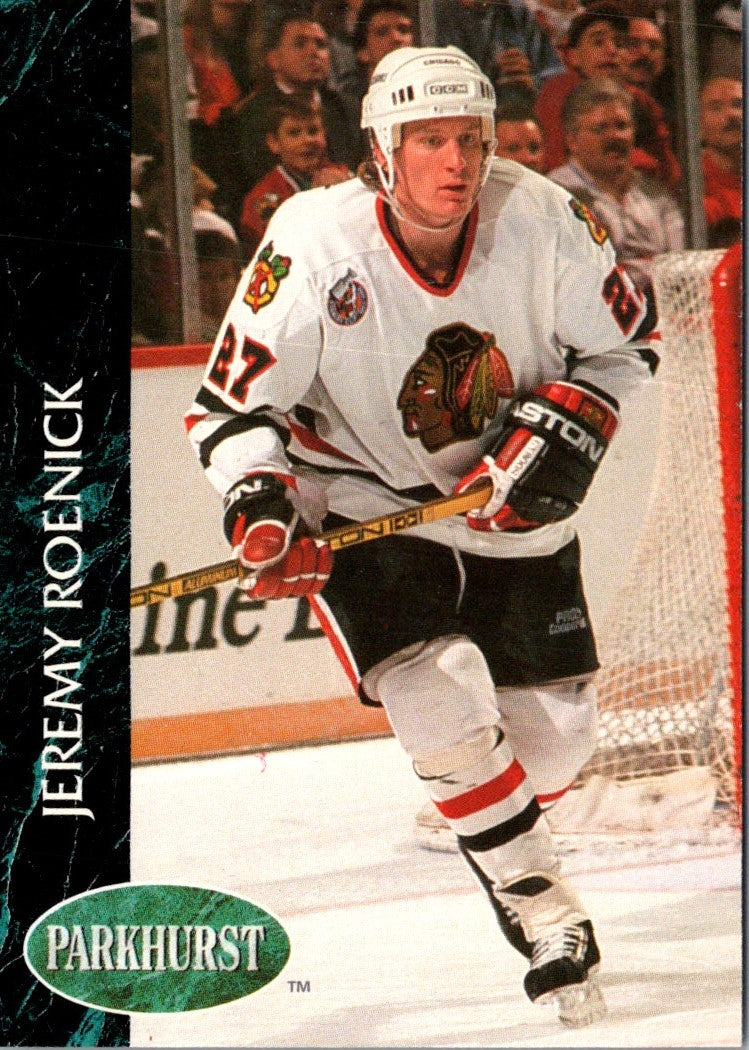 This 1993 Parkhurst Jeremy Roenick #309Chicago Blackhawks card is a great addition to any hockey fan's collection. Featuring a classic black and white team photo of Roenick, this card is a must-have souvenir of his time with the Blackhawks. It captures the essence of a legendary player in a timeless and classic design. With a glossy finish and a crisp, clear photo, this card is sure to be a great addition to any collection!