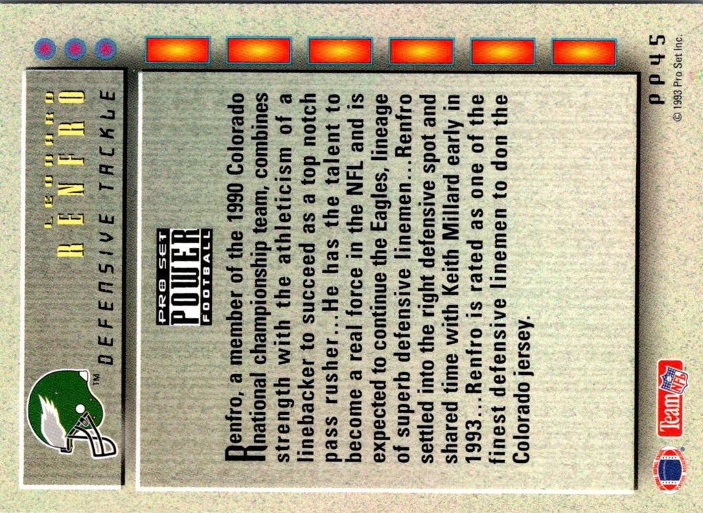 This 1993 Pro Set Power Update Prospects Leonard Renfro #PP45 card is a must-have for Philadelphia Eagles fans. Featuring an image of the beloved defensive back, this card is a great addition to any collection. The card is printed with bold colors and clearly shows the team colors and logo. It also includes key statistics and career highlights printed on the back. This card is a great way to honor a true Eagles legend, and is a great addition to any collection.