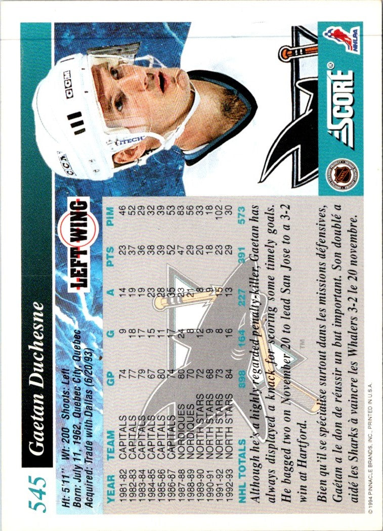 This 1993 Score Gaetan Duchesne #545San Jose Sharks card celebrates the career of a three-time All-Star. Featuring a full-color action shot of Duchesne in his Sharks uniform, the card is perfect for any fan of the San Jose franchise. The back of the card contains Duchesne's career highlights and statistics, making it a great addition to any hockey collection. Add this must-have card to your collection today and commemorate the career of a true All-Star!