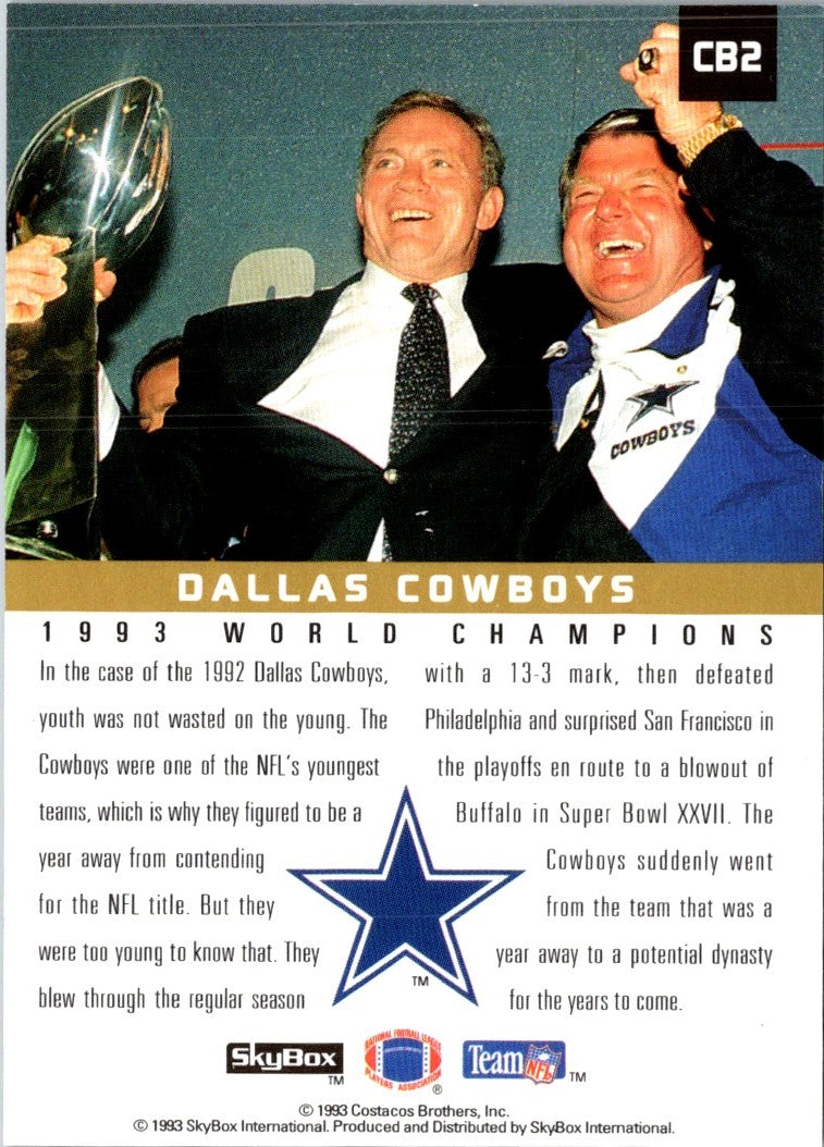 The 1993 SkyBox Premium Costacos Brothers 1993 World Champions #CB2 Dallas Cowboys is the perfect way to show your support for the team that brought home the championship. Featuring a dynamic design and vibrant colors, this card is sure to be a standout in any collection. From the iconic Cowboys star to the bold team name lettering, you'll be reminded of the team's remarkable success every time you look at it. With its high-quality construction and attention to detail, this card is a must-have for any Cowboys fan. Celebrate the Cowboys' 1993 championship victory and get your SkyBox Premium Costacos Brothers 1993 World Champions #CB2 Dallas Cowboys card today!