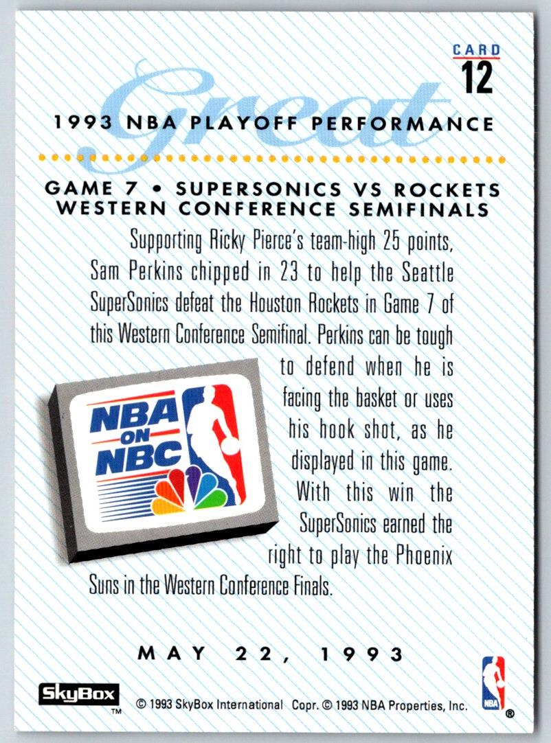 This 1993 SkyBox Sam Perkins #12 Seattle SuperSonics card is a must-have for any basketball fan's collection. Featuring a classic image of Sam Perkins in his SuperSonics uniform, this card is a great way to commemorate the all-star player's career. The card is printed on high-quality card stock, with a glossy finish that really brings out the colors and details. The reverse of the card features game stats and a biography of the player, making it a great piece of memorabilia. Add this card to your collection today and pay tribute to one of the greatest players in NBA history.