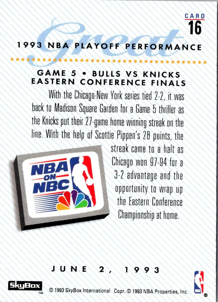 The 1993 SkyBox Scottie Pippen card #16Chicago Bulls features a classic portrait of the all-time great on a glossy cardstock background. His iconic red, white, and black Bulls jersey stands out against the bright colors of the card. Pippen’s stats from the 1992-1993 season are featured on the back of the card, along with a brief biography. This card is a must-have for Bulls fans and basketball card collectors alike. Add it to your collection today!