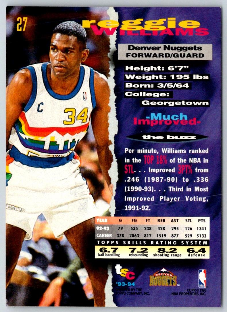 This 1993 Stadium Club First Day Issue Reggie Williams #27 Denver Nuggets card is a must-have for any serious sports collector. Features a full-color image of Reggie Williams in his Denver Nuggets uniform, with a glossy finish that brings out the vivid details. An official card of the 1993 Stadium Club First Day Issue Series, it is a great addition to any collection. Perfect for displaying and preserving the legacy of one of the game's greatest players.