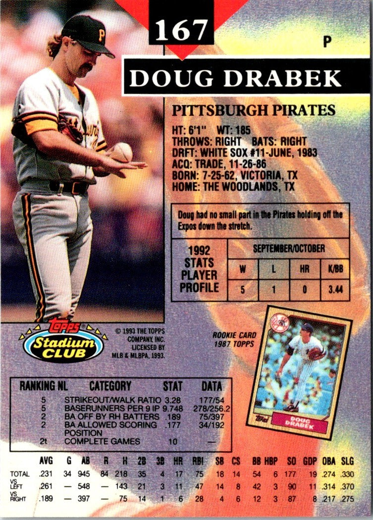 This 1993 Stadium Club First Day Production Doug Drabek #167 card is a fantastic piece of sports memorabilia for any Pittsburgh Pirates fan. Featuring a full-color action photo of Drabek, the card is printed on high-quality card stock for durability and features the Stadium Club logo on the back. This card is a great way to honor the career of one of baseball's most prolific pitchers and a Pirates legend. Add this piece of sports history to your collection today!