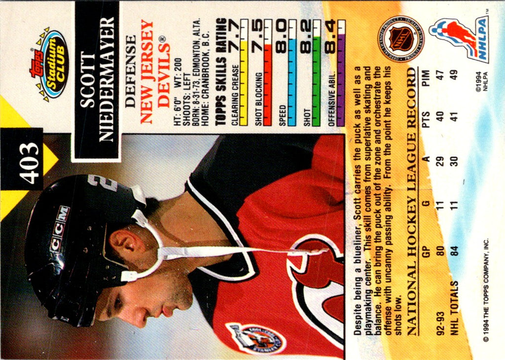 This 1993 Stadium Club #403 card of Scott Niedermayer is a great addition to any hockey fan's collection. Featuring a full-color team photo of the New Jersey Devils, this card captures Scott in mid-action as he shows off his speed and skill. With his career-long tenure with the Devils, Scott was an integral part of the team's success, and this card is a great way to remember his contributions. Add it to your collection today and show your support for the legendary Scott Niedermayer.