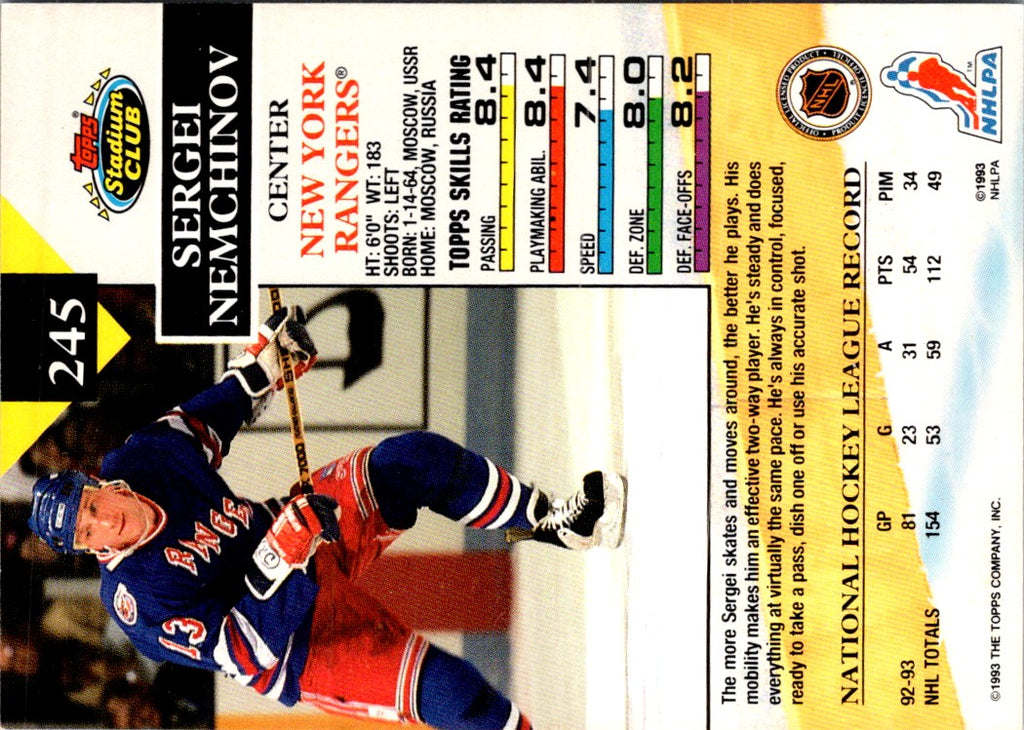 This 1993 Stadium Club Sergei Nemchinov #245 card from the New York Rangers features a glossy, high-definition image of the legendary Russian forward. As one of the most successful and decorated Rangers players of all-time, Nemchinov's card is a must-have for any true fan of the franchise. The card is printed on thick card stock, and is perfect for display or for any collection. Add this amazing piece of hockey history to your collection today!