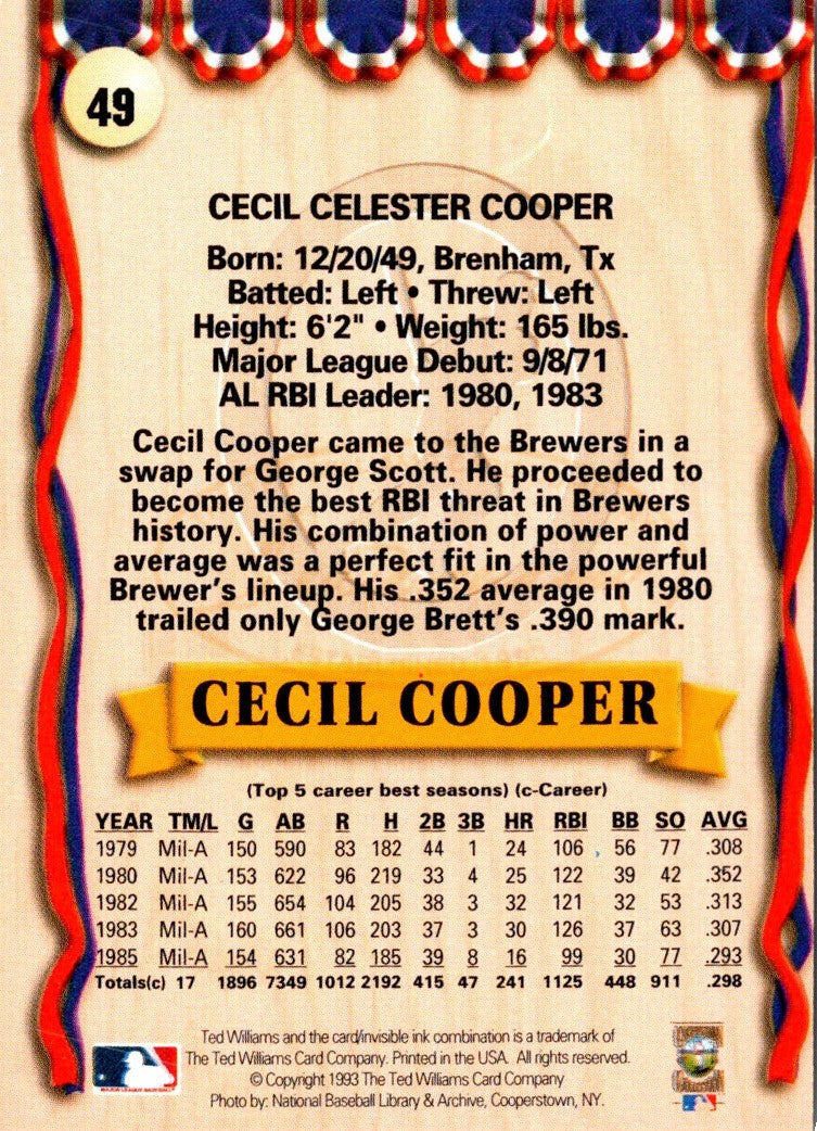 1993 Ted Williams Cecil Cooper #49