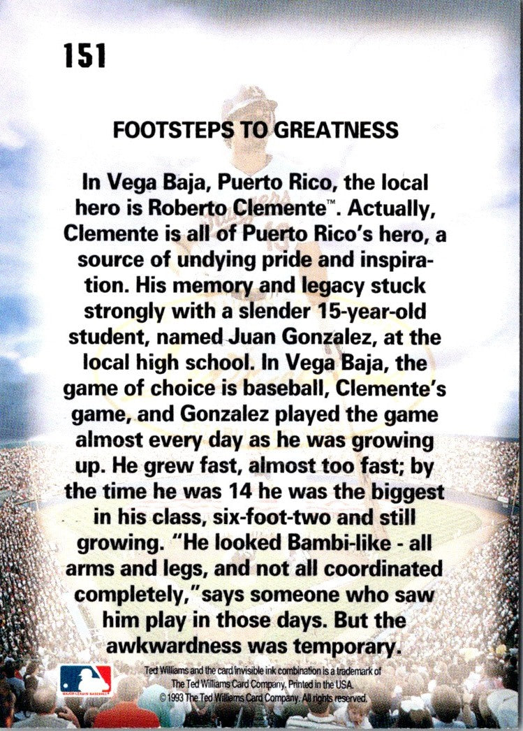 Description: 1993 Ted Williams Juan Gonzalez #151A