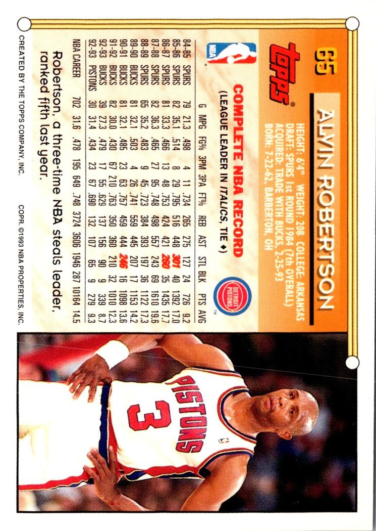 This 1993 Topps Alvin Robertson #65 Detroit Pistons card is a must-have for basketball fans and collectors alike! Featuring a classic design with a vibrant image of Robertson in full action, this card is sure to bring your collection to the next level. This card is in great condition, and features Robertson's vital stats and career highlights from the 1993 season. Don't miss out on this amazing piece of sports memorabilia!
