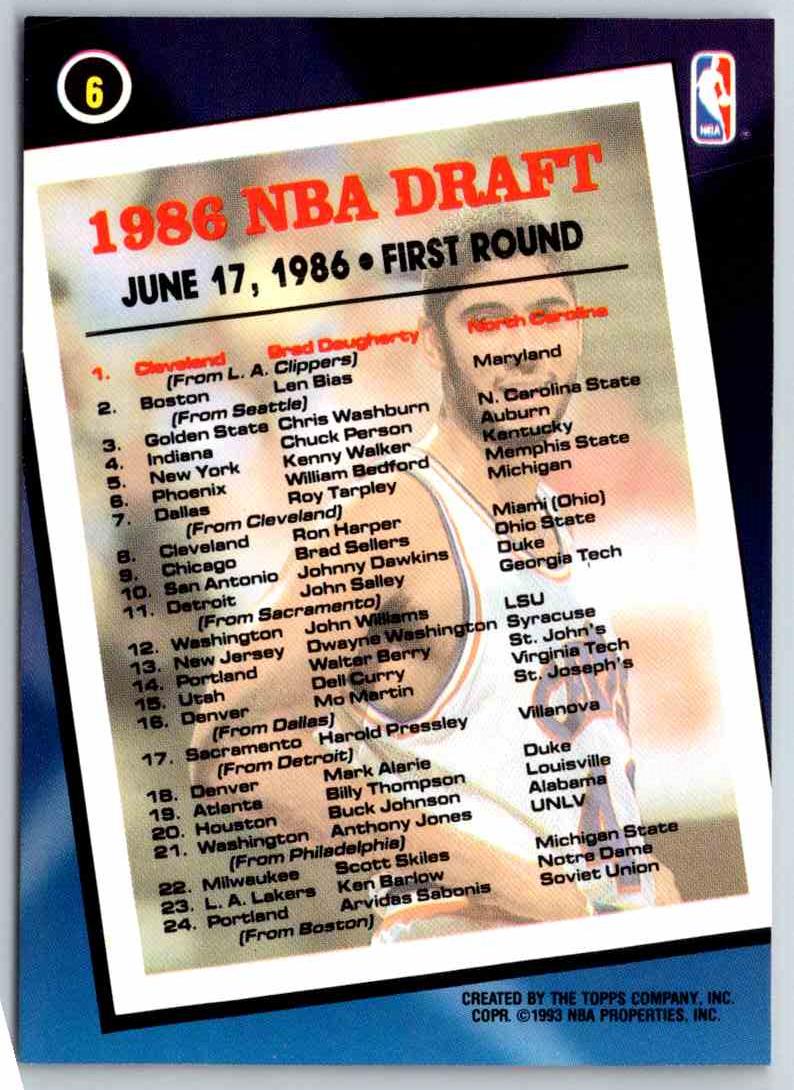 This 1993 Topps Brad Daugherty #6 card is a must-have for basketball fans. Featuring the Hall of Famer in his classic Cavaliers uniform, this card is the perfect addition to any collection. Boasting a crisp full-color photo, this card is a great way to commemorate one of the greatest big men in the game.
