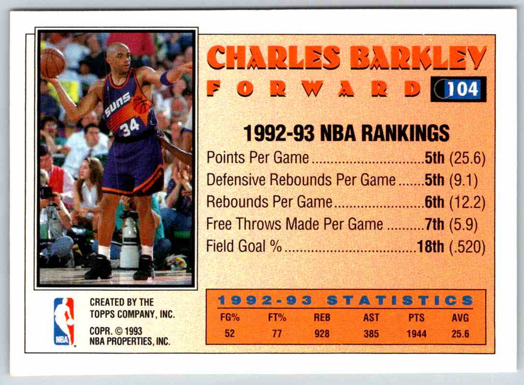 Add the 1993 Topps Charles Barkley #104 card to your collection! This card captures the 1993 NBA season with a bold, dynamic image of the superstar forward in action. His statistics are proudly displayed on the back, including his averages of 23.1 points, 11.1 rebounds, and 5.2 assists per game. This card is perfect for any collector looking to commemorate one of the best players of the 1990s.