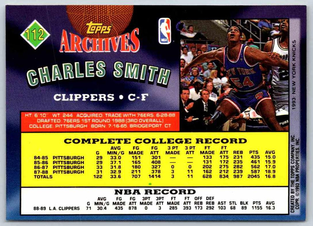 This 1993 Topps Charles Smith #112 card is a must-have for any basketball fan! This card features a great full-body shot of NBA star Charles Smith. He looks confident and ready to take on any opponent. The card also displays Smith's stats on the back, so you can keep track of his progress throughout the season. Add this card to your collection today and show off your devotion to your favorite player.