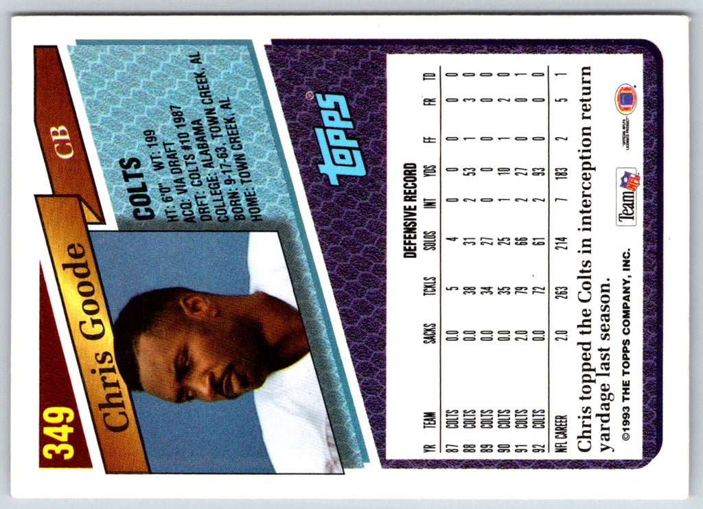 This 1993 Topps Chris Goode #349 card is a great addition to any collection. Show off your Indianapolis Colts pride with this card featuring a high-quality image of the quarterback and a full-color team logo. The card is in near mint condition, with no creases or discoloration. This card also features stats from the '92 season and is a great way to commemorate Chris Goode's rookie year in the NFL. Add this card to your collection today and show your team spirit!