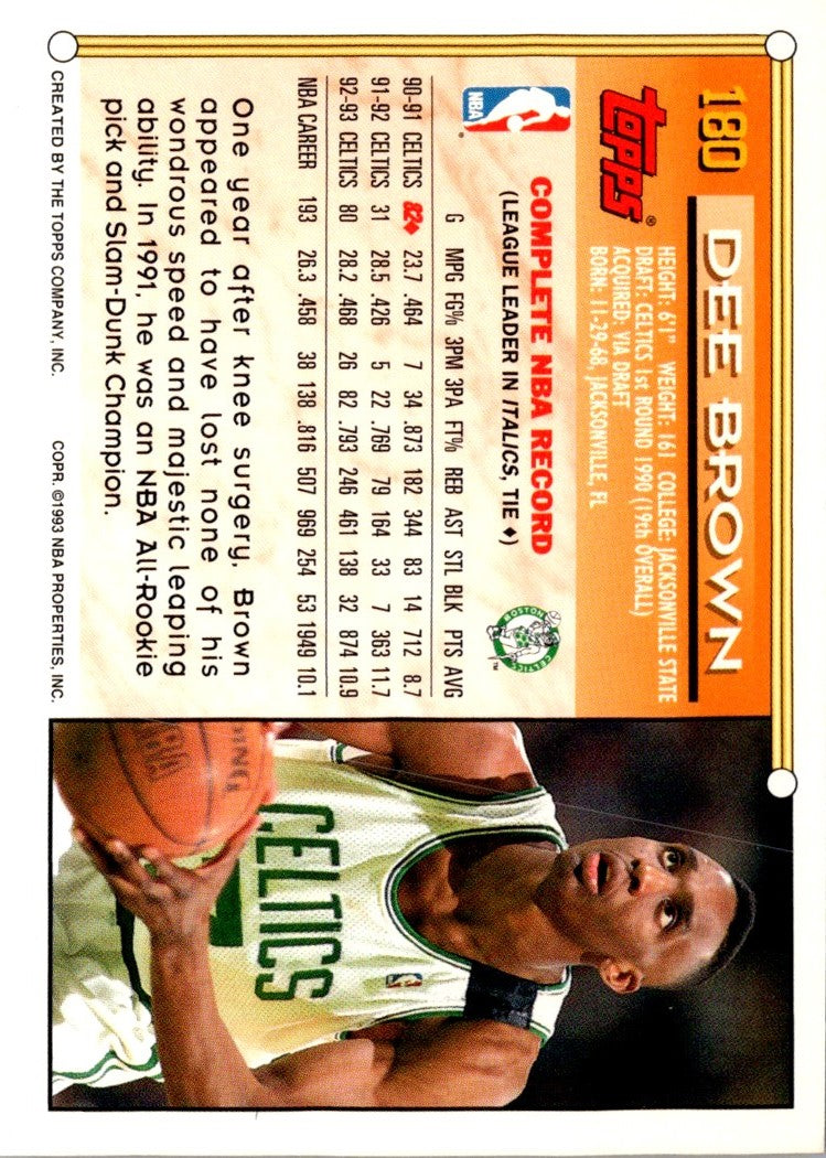 This 1993 Topps Dee Brown #180 card is an essential piece for any Boston Celtics fan's collection. Featuring a full-color image of the legendary guard in mid-action, this card captures the energy and excitement of the game. It is an officially licensed product with a glossy finish and sharp corners, ensuring that it will remain in pristine condition for years to come. With its unique design, this card is sure to be a hit with collectors. Add it to your collection today and celebrate the legacy of one of the Celtics' greatest players!