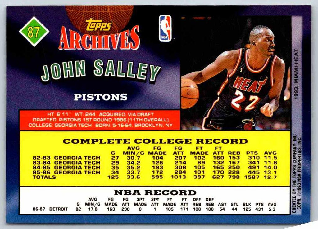 John Salley was the first player to win four NBA Championships since Bill Russell. Celebrate his legacy with this 1993 Topps #87 card. Featuring a classic portrait of Salley in his Detroit Pistons uniform, it captures the intensity and drive of the future Hall of Famer. Show your admiration for Salley's amazing career and add this card to your collection today.