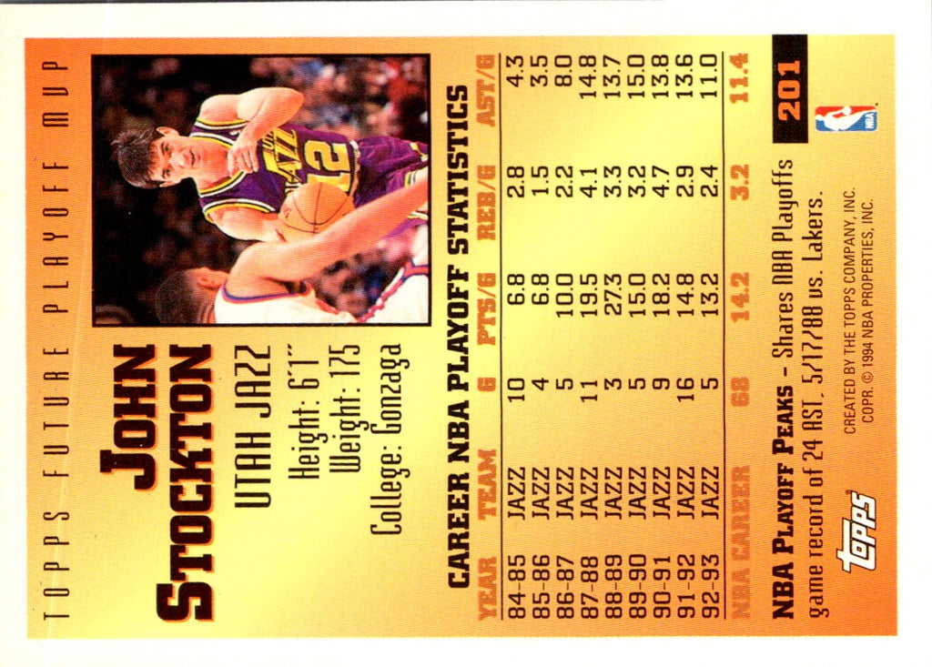 This 1993 Topps John Stockton #201 Utah Jazz card captures the legendary point guard in full action, with a classic shot of him driving into the lane. His Hall of Fame career is commemorated on this card, which features Stockton's iconic Utah Jazz jersey and the classic Topps design. It's a must-have for any collector of John Stockton memorabilia or Utah Jazz fan.