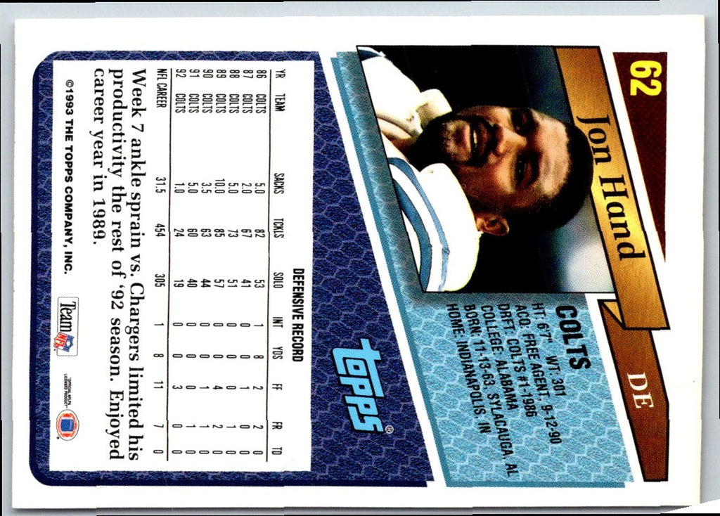 This 1993 Topps Jon Hand #62 Indianapolis Colts card is a must-have for any fan of the team. Featuring a portrait of Hand in his signature Colts uniform, this card is sure to be a conversation starter. Hand was an integral part of the Colts' success in the 1990s, and is remembered fondly by the fans. So don't miss out on your chance to add this card to your collection today!