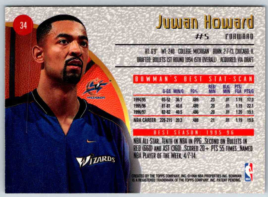 This 1993 Topps Juwan Howard #34 card is a must-have for any basketball card collector. The card features Howard in his Washington Bullets uniform and highlights a vibrant photo of him in action on the court. The card is printed on high-quality card stock and has a glossy finish. The back of the card includes Howard's career stats from the 1992-1993 season, along with a brief biography. This is the perfect card to add to your collection and relive the great basketball moments of the past.