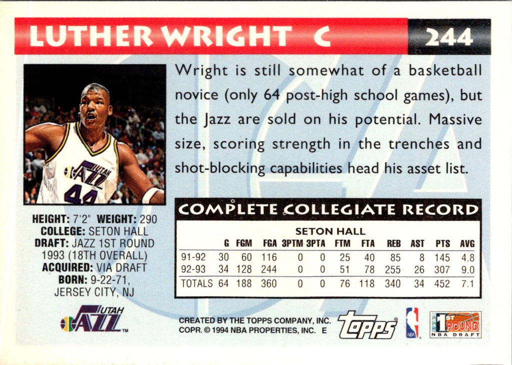 1993 Topps Luther Wright #244 is a must-have for any Utah Jazz fan's collection. Featuring a vibrant illustration of Luther Wright in action, this card captures the energy and athleticism of the beloved player. With a glossy finish, this card is perfect for any fan looking to add the perfect piece to their collection. Show your dedication to the Utah Jazz with this iconic card.