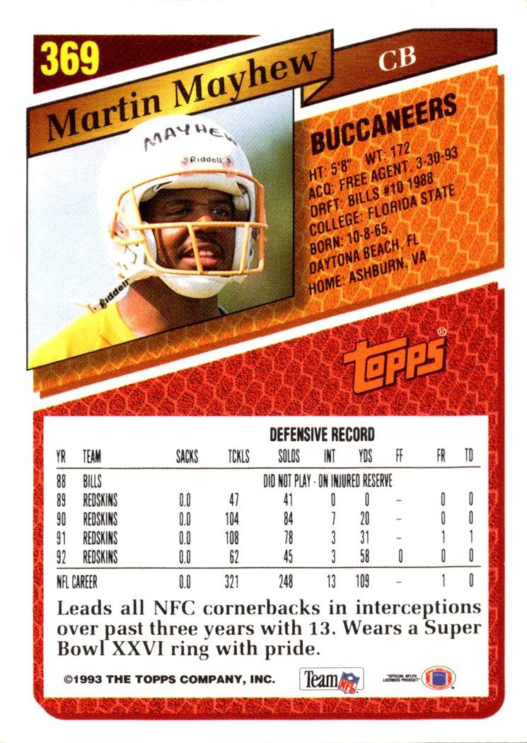 This 1993 Topps Martin Mayhew #369 Tampa Bay Buccaneers card will make a great addition to any collection. Featuring sharp, vibrant colors, and a crisp image of Martin Mayhew, this card is sure to be a hit with Buccaneers fans. With detailed stats from his career, this card is a great way to honor one of the greatest Buccaneers players of all time. Get your hands on this card today and add it to your collection!