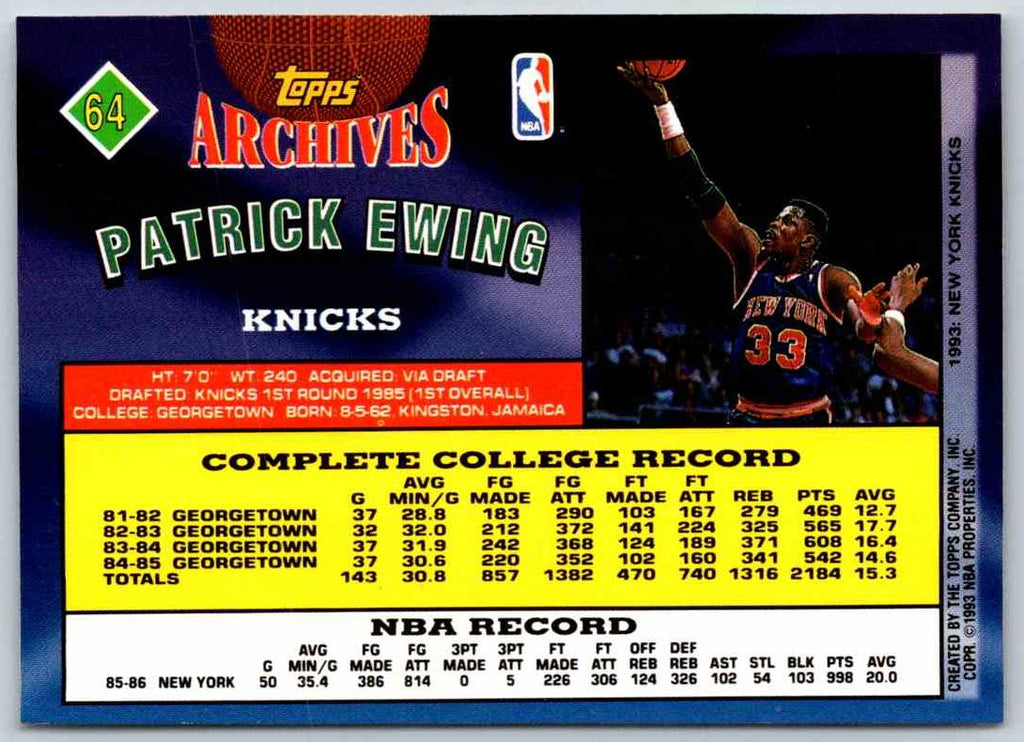This 1993 Topps Patrick Ewing #64 card is a must-have for any basketball fan! The card features a dynamic photo of Ewing in his Knicks uniform, with a blue and orange border around the edges. The back of the card displays his entire career stats, including his time with the Knicks and the Olympic team. This card is a great collectible, and is sure to make a great addition to any collection.