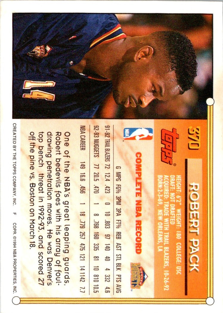 This 1993 Topps Robert Pack #370 Denver Nuggets card is a must-have for any basketball fan. Featuring a dynamic portrait of the player, this card is a perfect addition to any collection. Pack includes a glossy finish and a vibrant blue and white design in the background. Card is in near mint condition, and is sure to be a great conversation piece. Add this card to your collection today!