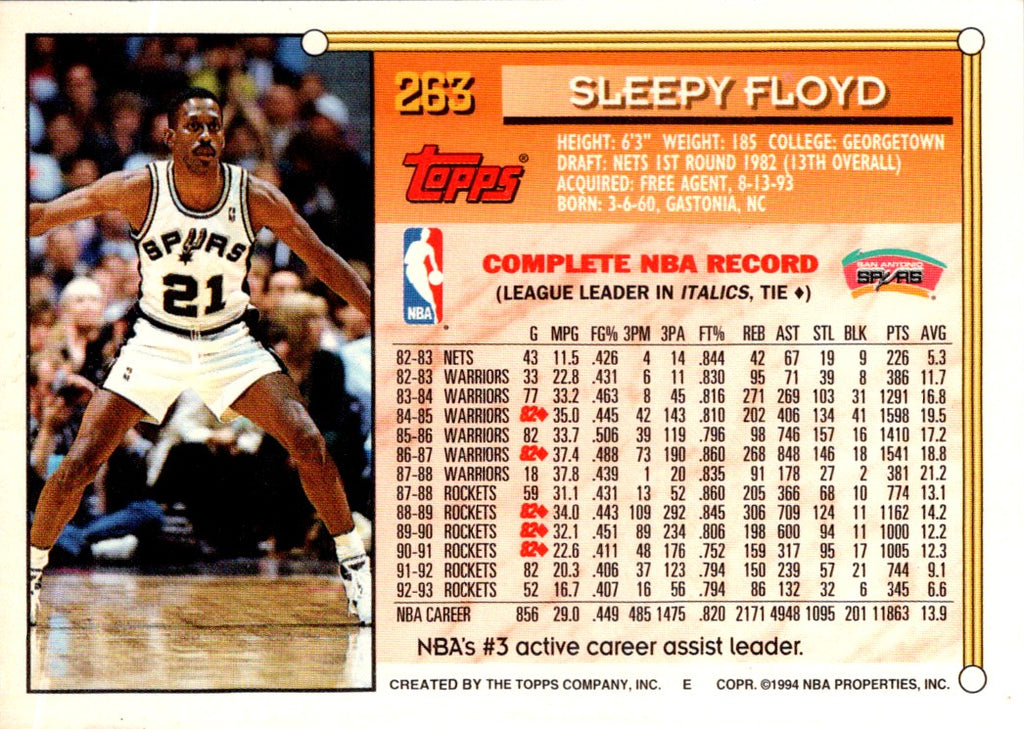 The 1993 Topps Sleepy Floyd #263 San Antonio Spurs card is a must-have for basketball fans and collectors. It features a classic black-and-white image of the legendary point guard in mid-action. The vivid colors and crisp details of the card make it a striking addition to any collection. The back of the card includes a bio of Sleepy Floyd and his career stats. This card is a great way to show your appreciation for the Hall-of-Fame guard and a great way to add to your collection.