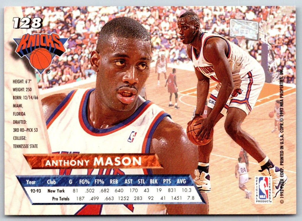 This 1993 Ultra Anthony Mason #128 New York Knicks card is a must-have for any basketball fan or collector! Featuring a classic black-and-white photo of Mason in action, this card is sure to bring nostalgia to any Knicks fan. The card is in near-mint condition, with sharp corners and crisp image quality that make it a great addition to any collection. With a career spanning 13 seasons, Anthony Mason remains a beloved figure in Knicks history and this card is the perfect way to commemorate his legacy. Whether you're just starting out in the hobby or are an experienced collector, don't miss out on this iconic card!