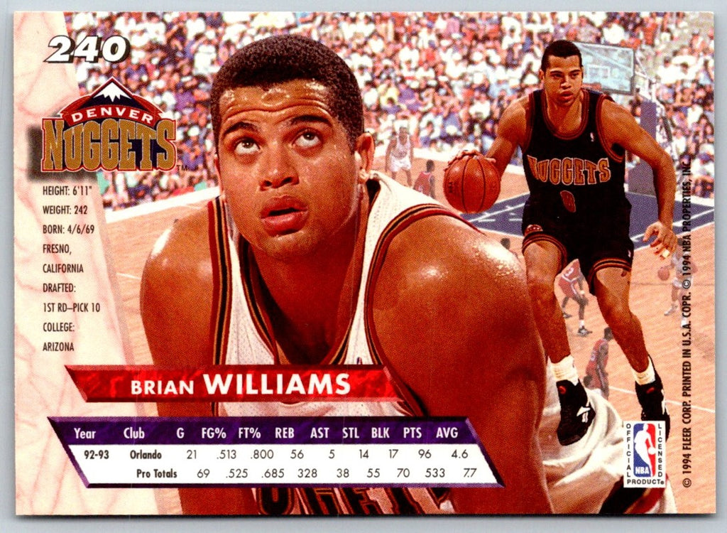 This 1993 Ultra Brian Williams #240 Denver Nuggets trading card is an essential piece for any basketball fan or collector. Featuring a classic black and white photo of Brian Williams in action on the court, this card is sure to excite any fan of the Denver Nuggets. The back of the card features key stats from the 1993 season and is sure to take any collection to the next level. Don't miss out on this opportunity to add a true classic to your collection!