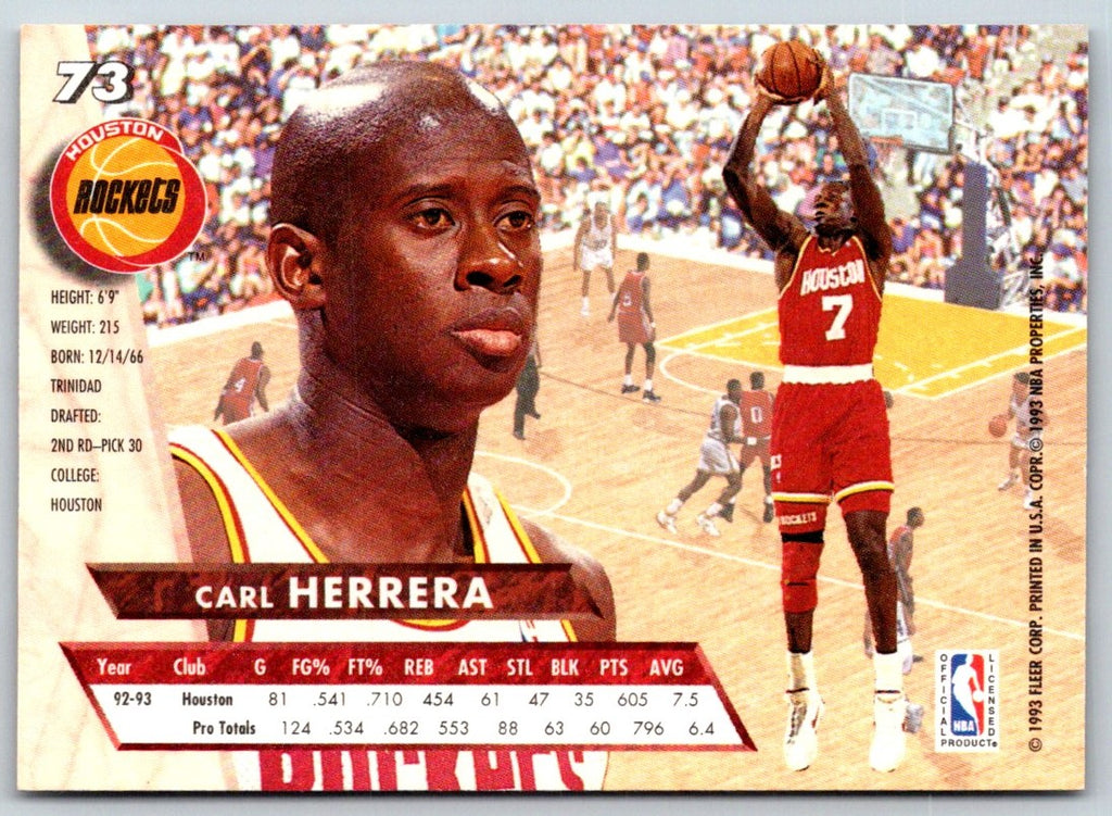 This 1993 Ultra Carl Herrera #73 Houston Rockets trading card is a must-have for any Rockets fan or card collector! Featuring a full-color action shot of Herrera in his Rockets jersey, this card is sure to be a great addition to any collection. The card is in mint condition and features a glossy finish. It's a great way to remember the career of one of Houston's most beloved players.