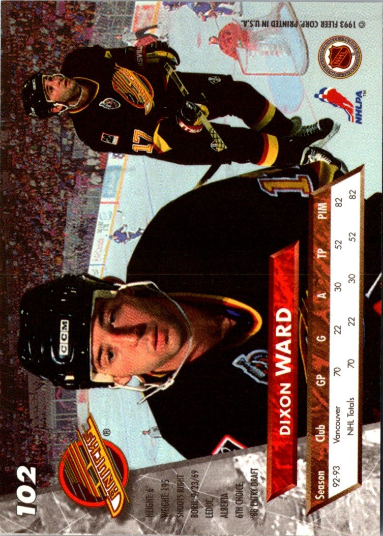 This 1993 Ultra Dixon Ward #102 Vancouver Canucks card is a great example of the early days of hockey cards. With a glossy finish and vibrant colors, this card is sure to make any collector smile. Featuring a close-up of Dixon Ward in his Canucks game day uniform, this card captures the energy of a classic hockey season. This card is a must-have for any collector looking to show off their Canucks pride. Add this card to your collection today and show your dedication to your favorite team!
