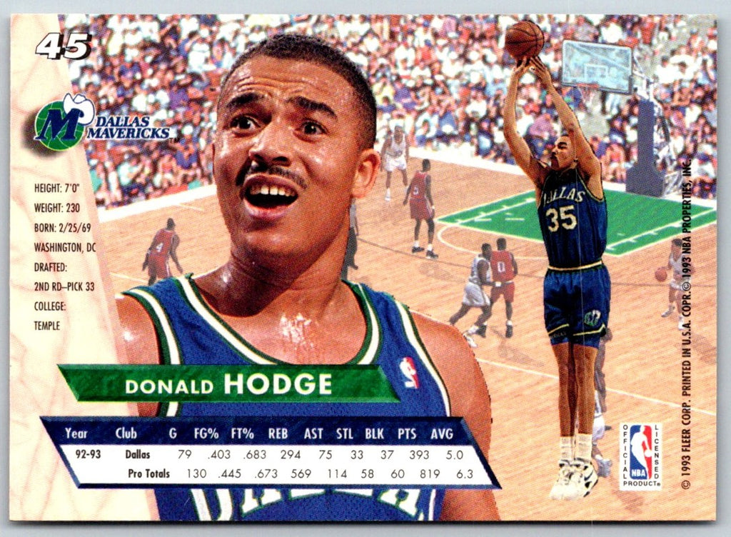 This is your chance to own a piece of NBA history! The 1993 Ultra Donald Hodge #45 Dallas Mavericks card is a must-have for any basketball fan. Featuring a sharp image of the legendary player, this card is a timeless collector’s item. Its glossy finish and detailed artwork make it an eye-catching addition to any collection. With its classic design, it is sure to become one of your most cherished possessions. Add this card to your collection today and celebrate the legacy of Donald Hodge!
