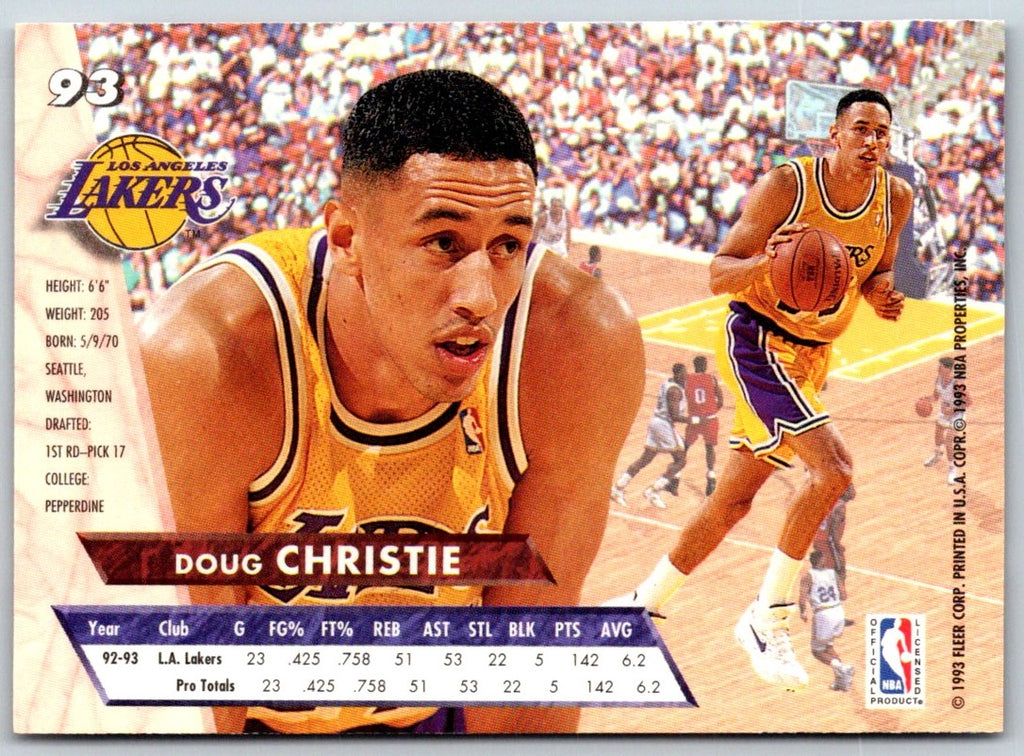 Step onto the court with the 1993 Ultra Doug Christie #93 Los Angeles Lakers card! Show your support for one of the greatest players of the 1990s. This card features an action-packed image of Christie in his purple and gold Lakers jersey. It captures his signature enthusiasm and drive every time he stepped onto the court. With this card, you can bring a piece of the game home and keep your favorite player close to your heart. Don't miss out on this incredible collector's item!