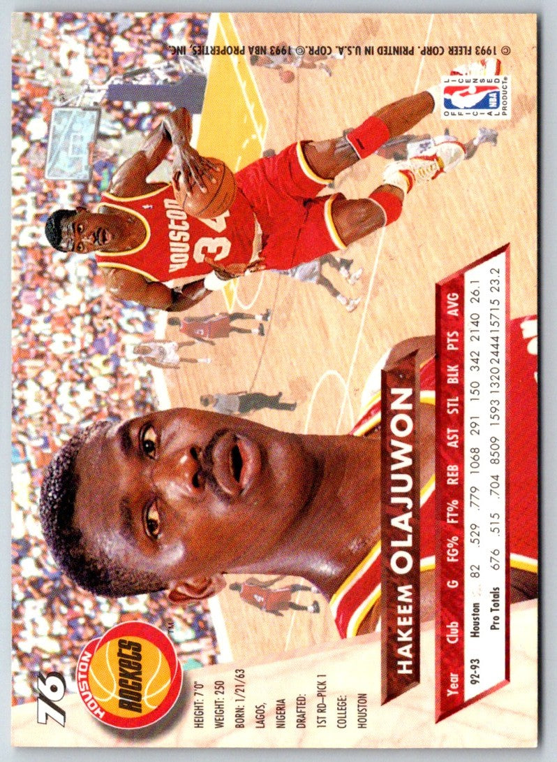 This 1993 Ultra Hakeem Olajuwon #76Houston Rockets trading card is the perfect item to add to any basketball fan's collection. Celebrate the legendary Hall of Famer and one of the greatest players of all time with this beautiful card. Featuring an iconic image of Olajuwon and a detailed look at his stats, this card is sure to be a timeless piece. With its high-quality construction and sharp design, it is the perfect way to commemorate one of the greats. Add this card to your collection today!