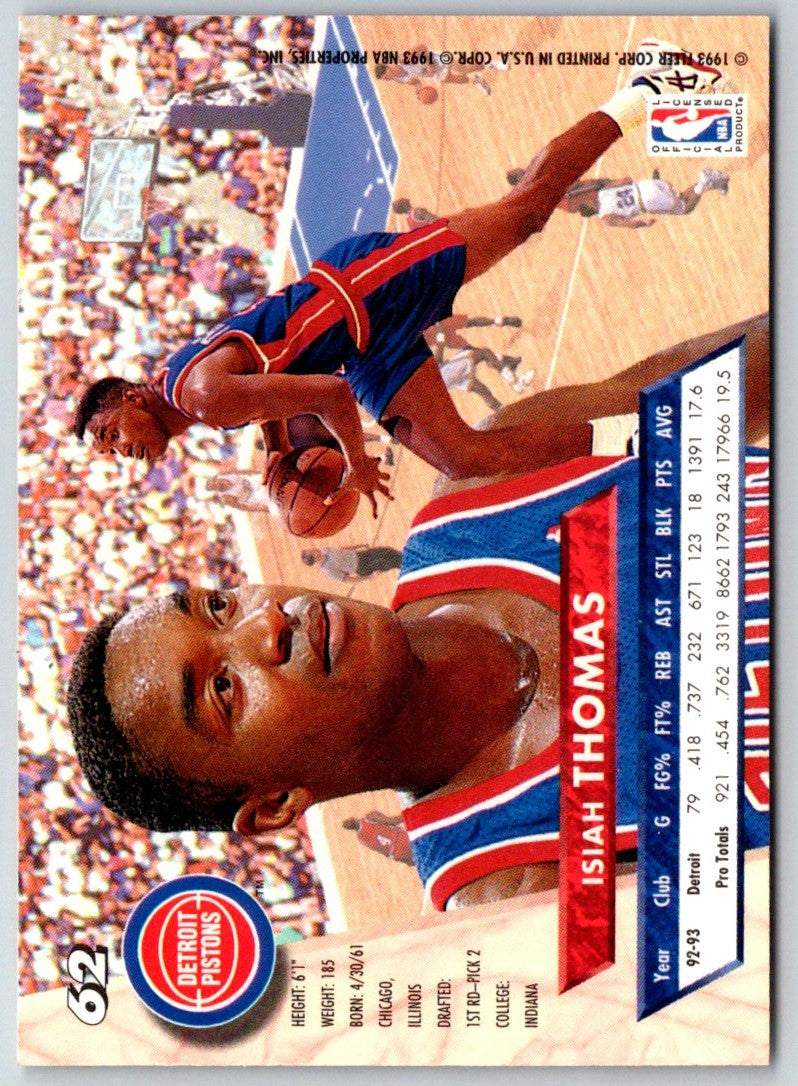 This 1993 Ultra Isiah Thomas #62 Detroit Pistons card is a must-have for any basketball fan and collector! Featuring a full-color image of Thomas in his Pistons uniform, this card captures the energy and athleticism of an all-time great. The back of the card highlights Thomas' career accomplishments and awards, making it a great addition to any collection! Get your hands on this timeless piece of basketball history today!