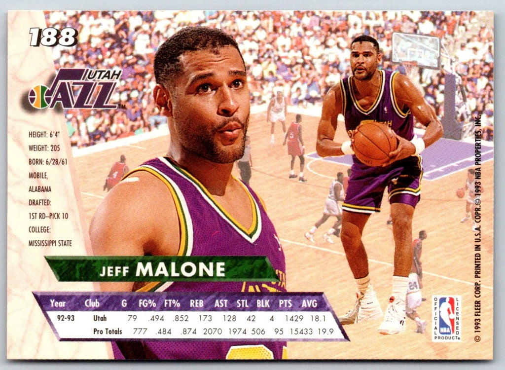 This 1993 Ultra Jeff Malone #188 Utah Jazz card is a great addition to any basketball fan's collection. It features a spectacular action shot of Malone mid-way through a move to the basket, perfectly capturing the intensity of the game. The card's back highlights Malone's career with the Jazz, including his impressive stats and accolades. This card is sure to be a treasured item for any Malone fan or collector.