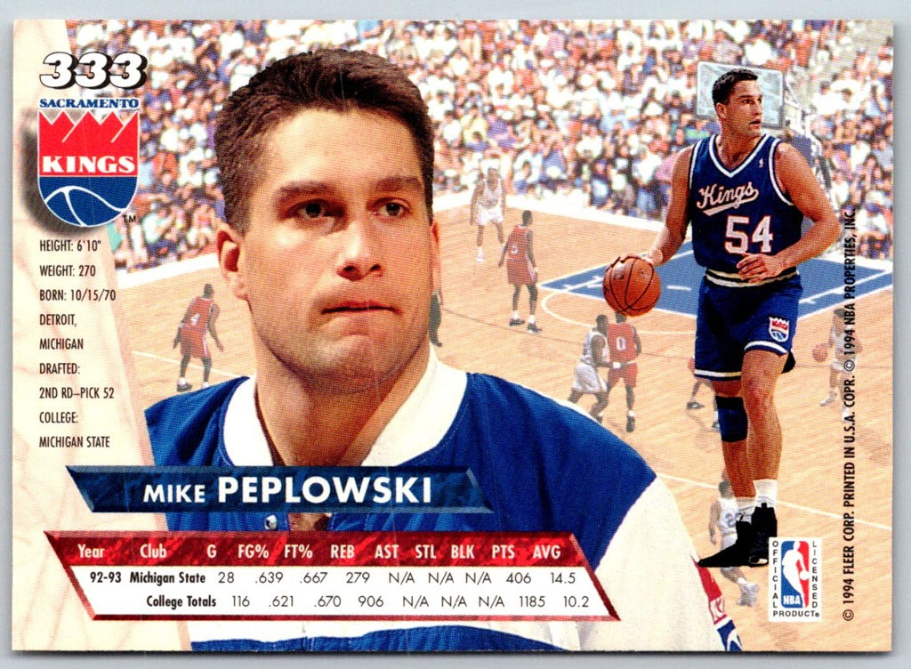 This 1993 Ultra Mike Peplowski #333 Sacramento Kings card is truly a collector's item. Featuring a dynamic illustration of Mike Peplowski in a Kings uniform, this card is sure to be a great addition to any fan's collection. The card is printed on high-quality cardstock with a glossy finish, making it a great display piece. The card features Mike Peplowski's stats and career highlights, making it a great conversation piece. Add this card to your collection today and celebrate the career of one of the Kings' all-time greats.