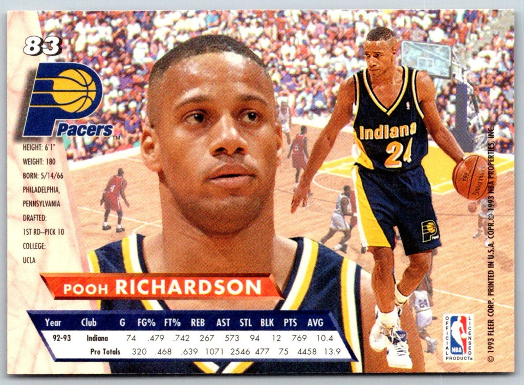 This Ultra Pooh Richardson #83 Indiana Pacers card is the perfect addition to any basketball fan's collection. Featuring a bold design with bright colors and a high-quality glossy finish, this card is sure to impress. This card features a color headshot of Pooh Richardson in his Indiana Pacers jersey. Richardson was a tremendous player and was a key part of the Pacers' success in the 1990s. This card is sure to be a treasured item in any fan's collection. Don't miss out on adding this card to your collection today!