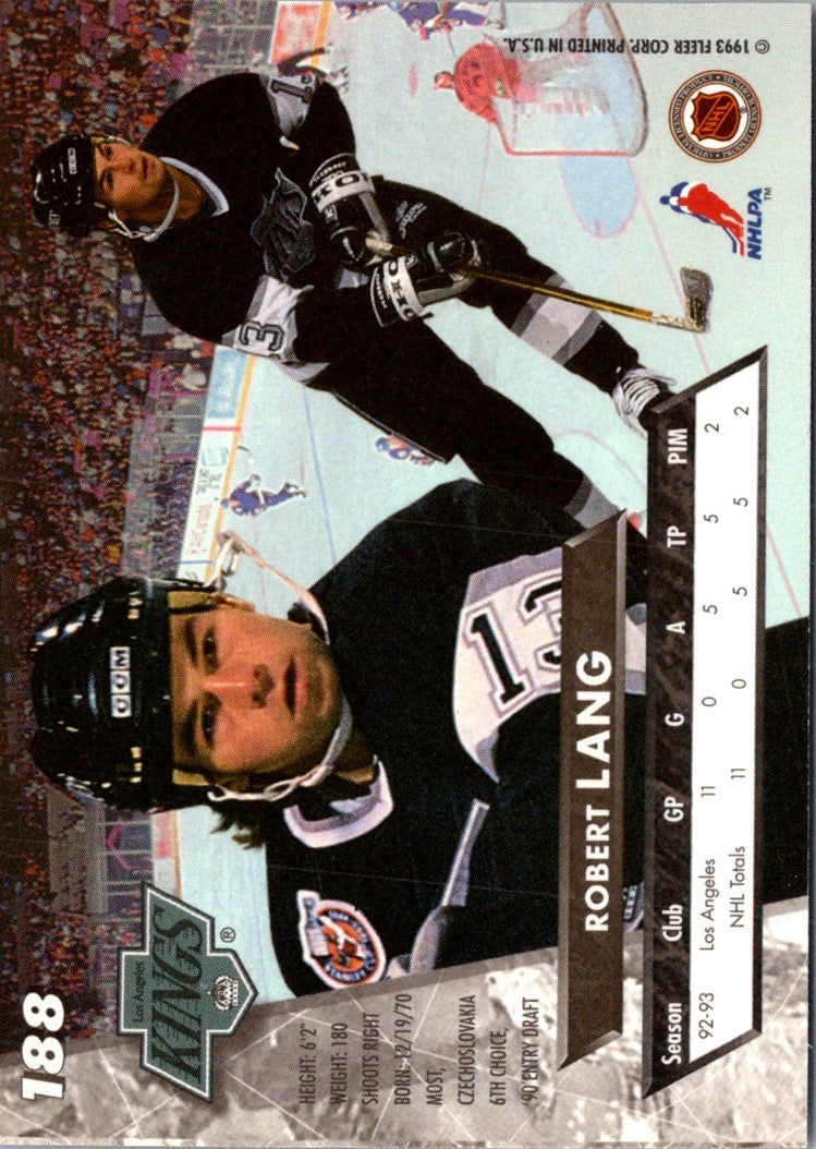 This 1993 Ultra Robert Lang #188 Los Angeles Kings card is a must-have for any hockey collector. Featuring Robert Lang in a full-action shot, this card is perfect for any Kings fan or hockey fan alike. The card is printed on thick, glossy stock and is in pristine condition, ensuring that it will stay in perfect condition for years to come. Add this classic piece to your collection today and show your support for the Los Angeles Kings!