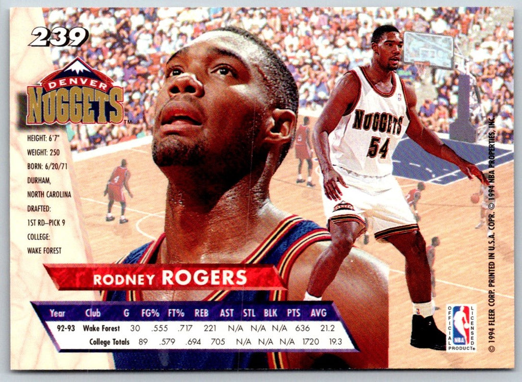 This Ultra Rodney Rogers #239 Denver Nuggets card brings you back to the 1993 season. Featuring a sharp image of the dynamic forward, the card captures his dynamic athleticism and fierce competitiveness. With a strong stat line and a classic design, this card is sure to please any Denver Nuggets fan. Add this card to your collection today to celebrate the career of Rodney Rogers!