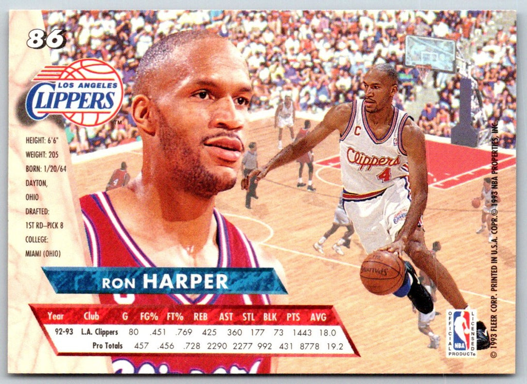1993 Ultra Ron Harper #86 Los Angeles Clippers is a must-have for any Clippers fan. This classic trading card features the iconic shooting guard in full uniform, with a crisp photo of him in action. It also has detailed stats and career highlights on the back. This card is a great way to commemorate the career of one of the all-time greats in the NBA. Add it to your collection today and show your Clippers pride!