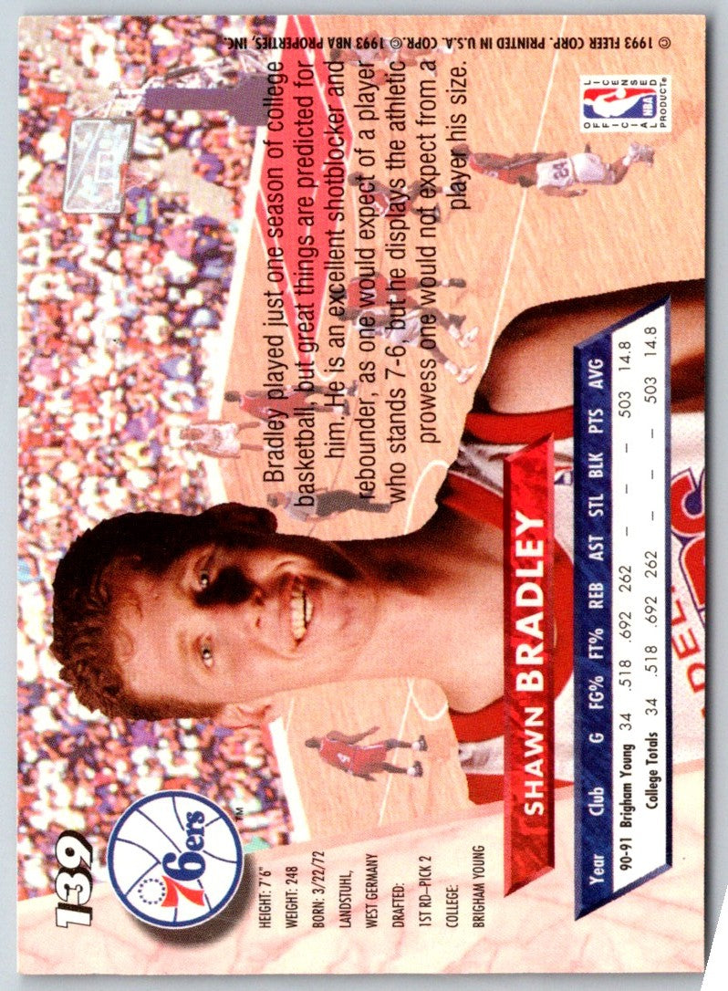 Shawn Bradley is the epitome of the modern basketball star. The 1993 Ultra Shawn Bradley card features a detailed image of the 7-foot-6 center in his Philadelphia 76ers jersey. The card has a beautiful glossy finish, which makes it a great addition to any basketball fan's collection. The card also features a full-color photo, which highlights the incredible athleticism of Bradley. This card is a great way to show your appreciation and admiration for the big man's impressive career. No collection is complete without this stunning card!