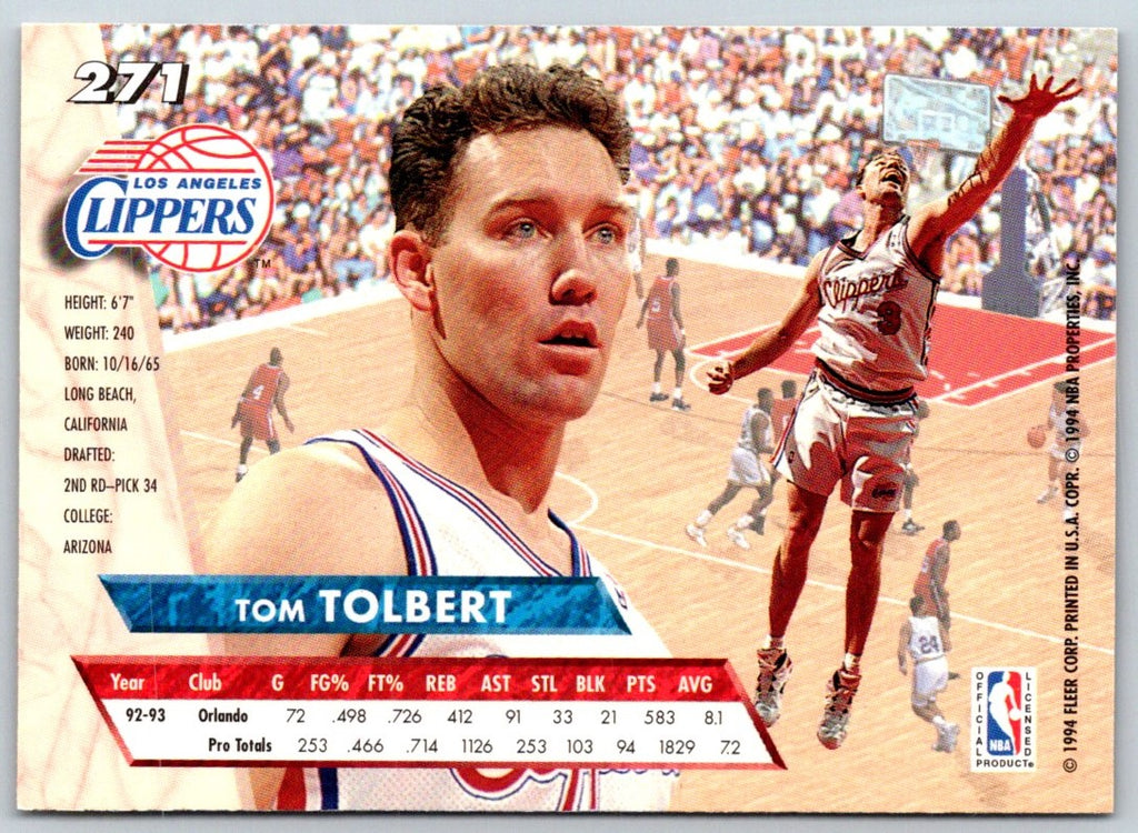The 1993 Ultra Tom Tolbert #271 Los Angeles Clippers is a highly collectible trading card. Featuring a full-color portrait of Tom Tolbert with the Clippers logo, this card is a must-have for any collector. Show your support for the Los Angeles Clippers with this classic card that captures the team's spirit. The card also features a detailed Stats section, giving you all the information you need to know about Tolbert's career. Add this card to your collection today and honor a great player in the history of the Clippers!