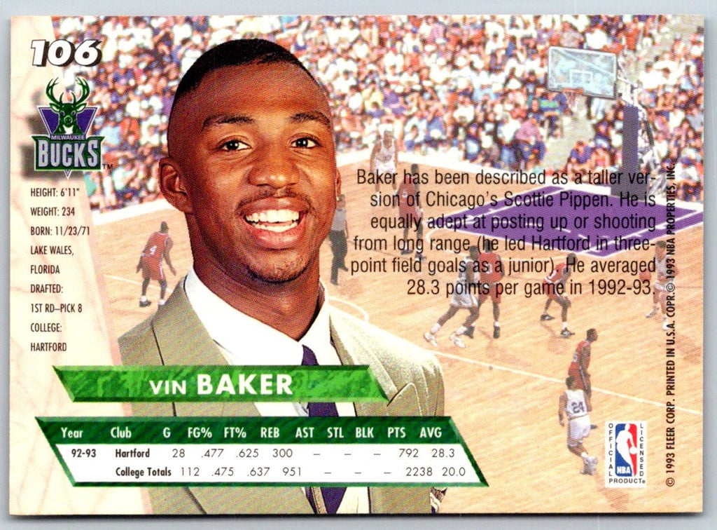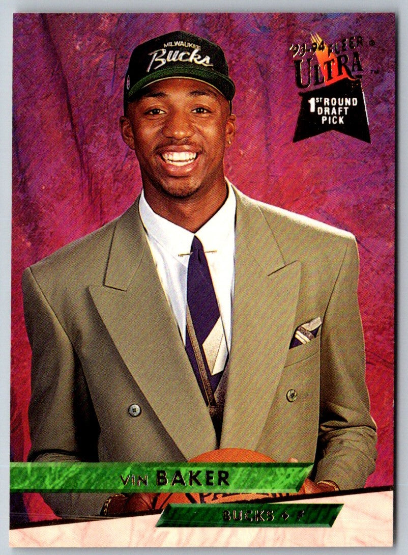 If you are a fan of the Milwaukee Bucks, then you need to add the 1993 Ultra Vin Baker #106 card to your collection. This card features a full-color image of the Bucks' star player, center Vin Baker. Baker was a four-time All-Star and an All-NBA third team selection in 1999. His talents were highly acclaimed and he was known for his stellar shooting, rebounding, and defensive abilities. This card is a must-have for any Bucks fan, as it captures the essence of Baker's career with the team. Add it to your collection today!