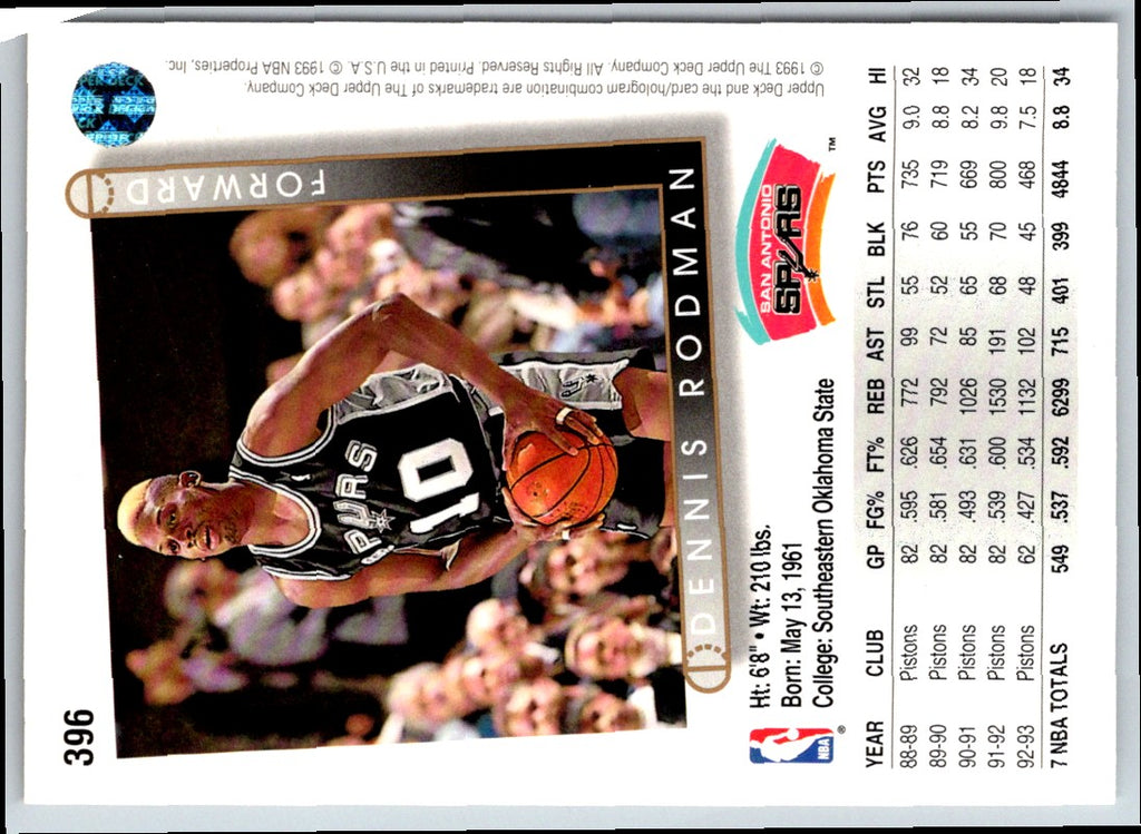 This 1993 Upper Deck Dennis Rodman #396 card is a must-have for any basketball fan! It features an action shot of the legendary Dennis Rodman in his San Antonio Spurs jersey, looking ready to take on the competition. The card is printed on glossy cardstock, with vivid colors and sharp details that truly capture the intensity of the game. It's a great way to show your love for the game and your appreciation for one of the greatest players of all time. Add this card to your collection today and make sure you don't miss out on a piece of sports history!