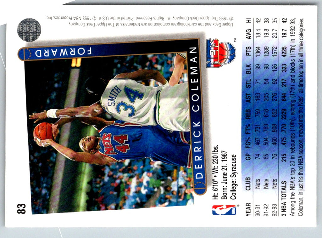 This 1993 Upper Deck Derrick Coleman #83 card is a must-have collector’s item for any New Jersey Nets fan. Featuring an action shot of Derrick Coleman in his New Jersey Nets uniform, this card is a great way to commemorate one of the greatest power forwards to ever suit up for the Nets. Perfect for any collection, this card is sure to be a hit with fans of all ages. Get your hands on this iconic piece of basketball history and add it to your collection today!
