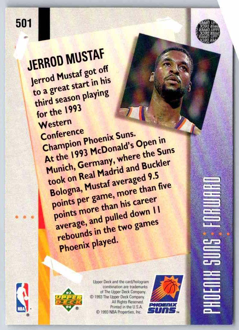 This 1993 Upper Deck Jerrod Mustaf card will be a great addition to your collection! The card features a picture of Mustaf with the Atlanta Hawks and a blue background. The card is in near mint condition and is sure to be a treasured part of any sports fan's collection. Mustaf was an All-Star in 1993 and was the 20th pick in the 1990 NBA Draft. With this card, you'll be able to relive the glory of Mustaf's basketball career. This timeless collectible will be a great way to honor Mustaf's legacy.