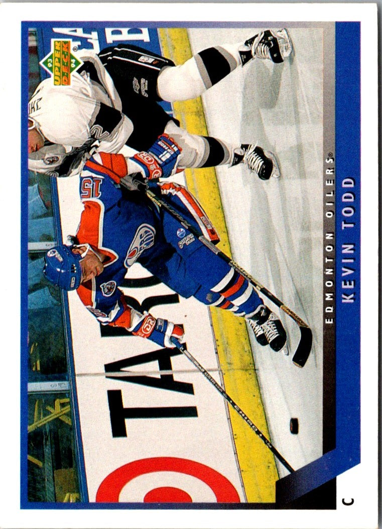 This 1993 Upper Deck Kevin Todd #88 Edmonton Oilers card is a great addition to any Oilers fan's collection! Featuring a vibrant photo of Todd in his Oilers jersey, this card is sure to be a hit with any hockey fan. It's also in excellent condition, and its graded as a mint 9 out of 10. Treat yourself or a friend to this beautiful card and add it to your sports memorabilia collection today!