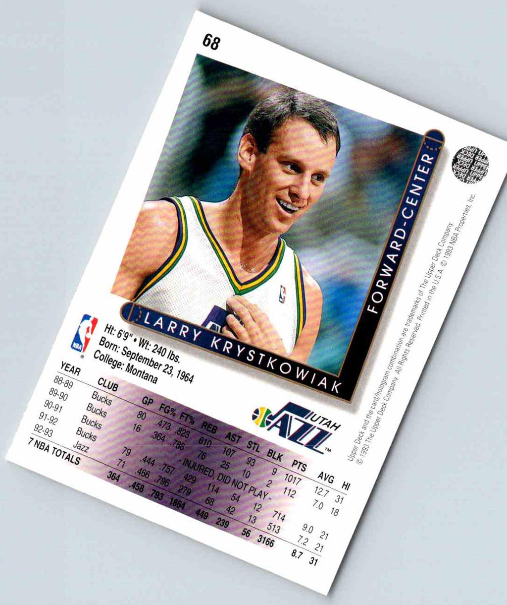 Add the 1993 Upper Deck Larry Krystkowiak #68 to your collection! This card features a full-bleed action shot of Krystkowiak in his Milwaukee Bucks uniform. The card is printed on sturdy card stock, making it a must-have item for any basketball fan. This card is perfect to put in a protective sleeve and store in a binder or frame it to show off on your wall. Make sure you don't miss out on adding this card to your collection!