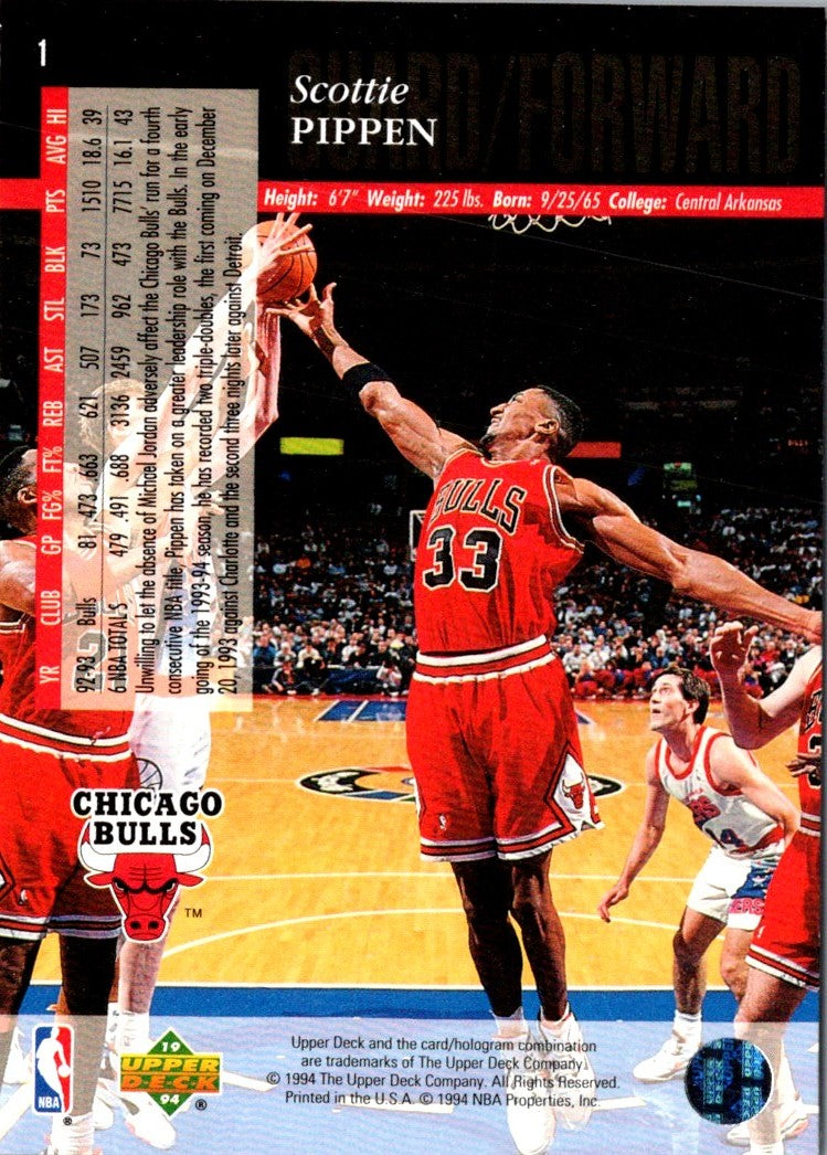 Commemorate the career of one of the all-time greats with this 1993 Upper Deck Scottie Pippen #1 card. Featuring a crisp black-and-white image of the Hall of Famer, this card is sure to be a hit with any basketball fan. Show off your favorite player with this collector's item that is sure to stand the test of time.